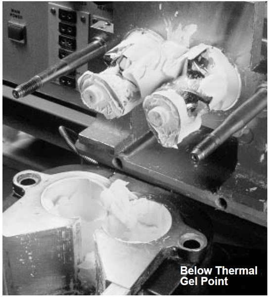 Diese Bilder zeigen eine Keramikmischung mit METHOCEL™, die in einem Drehmomentrheometer bei Temperaturen über und unter dem thermischen Gelpunkt beobachtet wurde. Wenn die Keramikmischung über dem thermischen Gelpunkt liegt, klebt sie nicht und kann sich bei der Keramikverarbeitung sauber von Metalloberflächen trennen. Diese Eigenschaft ist beim Spritzgießen und bei der Herstellung feiner Keramikextrusionen äußerst hilfreich.