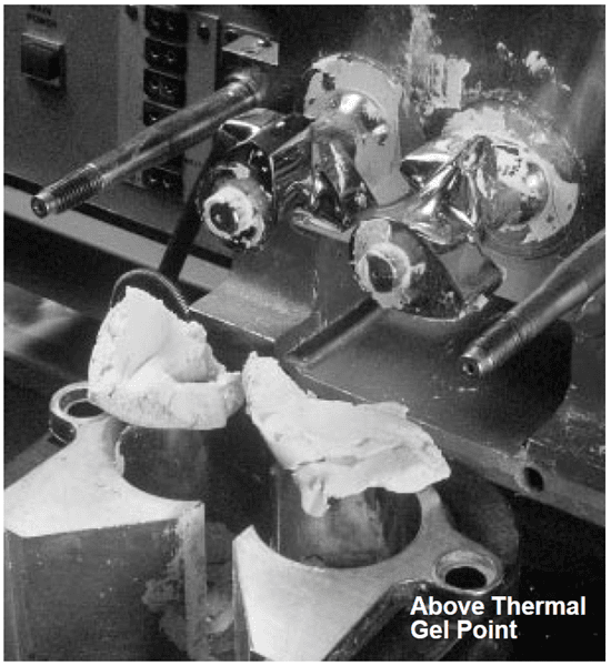 These images show a ceramic mix containing METHOCEL™ observed in a torque rheometer at temperatures above and below the thermal gelation point. When the ceramic mix is above the thermal gelation point, it does not stick and is able to separate cleanly from metal surfaces during ceramic processing. This characteristic is extremely helpful during injection molding and engineering fine ceramic extrusions.