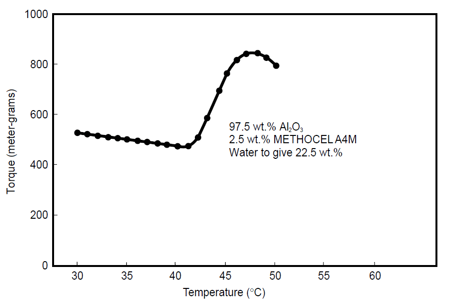 The graph above illustrates the sharp increase in green strength using a torque rheometer to measure the viscosity of an alumina ceramic mixture containing METHOCEL™ A4M when held above thermal gelation temperatures.