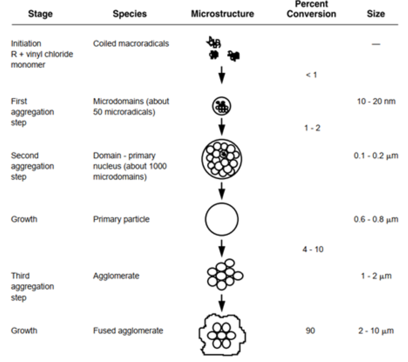 It is crucial for PVC manufacturers to control VCM porosity and bulk density of the resultant PVC resin grain. These properties are directly related to droplet size and are important when producing higher-purity PVC or determining if flexible or rigid PVC will be made. The porosity of polyvinyl chloride resin grains influences the ease of removing unreacted VCM and the absorbance of additives such as plasticizers, stabilizers, pigments, and impact modifiers. On the other hand, bulk density plays a significant role when considering material storage, flow, and handling of resin. The diagram below illustrates the mechanism that takes place for suspension polyvinyl chloride polymerization.
