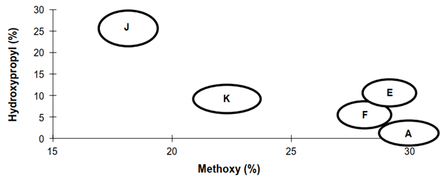 Suspending Agent There are a variety of METHOCEL™ grades with different substitution levels for methyl and hydroxypropyl groups attached to the cellulose backbone. In the diagram below, a letter is used in each product to denote the specific degree of substitution of both methoxy and hydroxypropyl groups.
